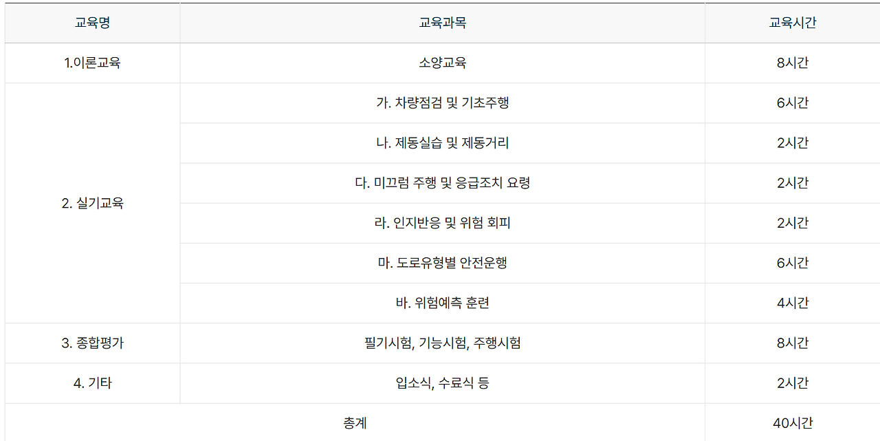 대구의 개인택시 양수교육은 5일 과정으로 진행되며, 총 교육 시간은 40시간입니다. 교육 내용은 다음과 같습니다.